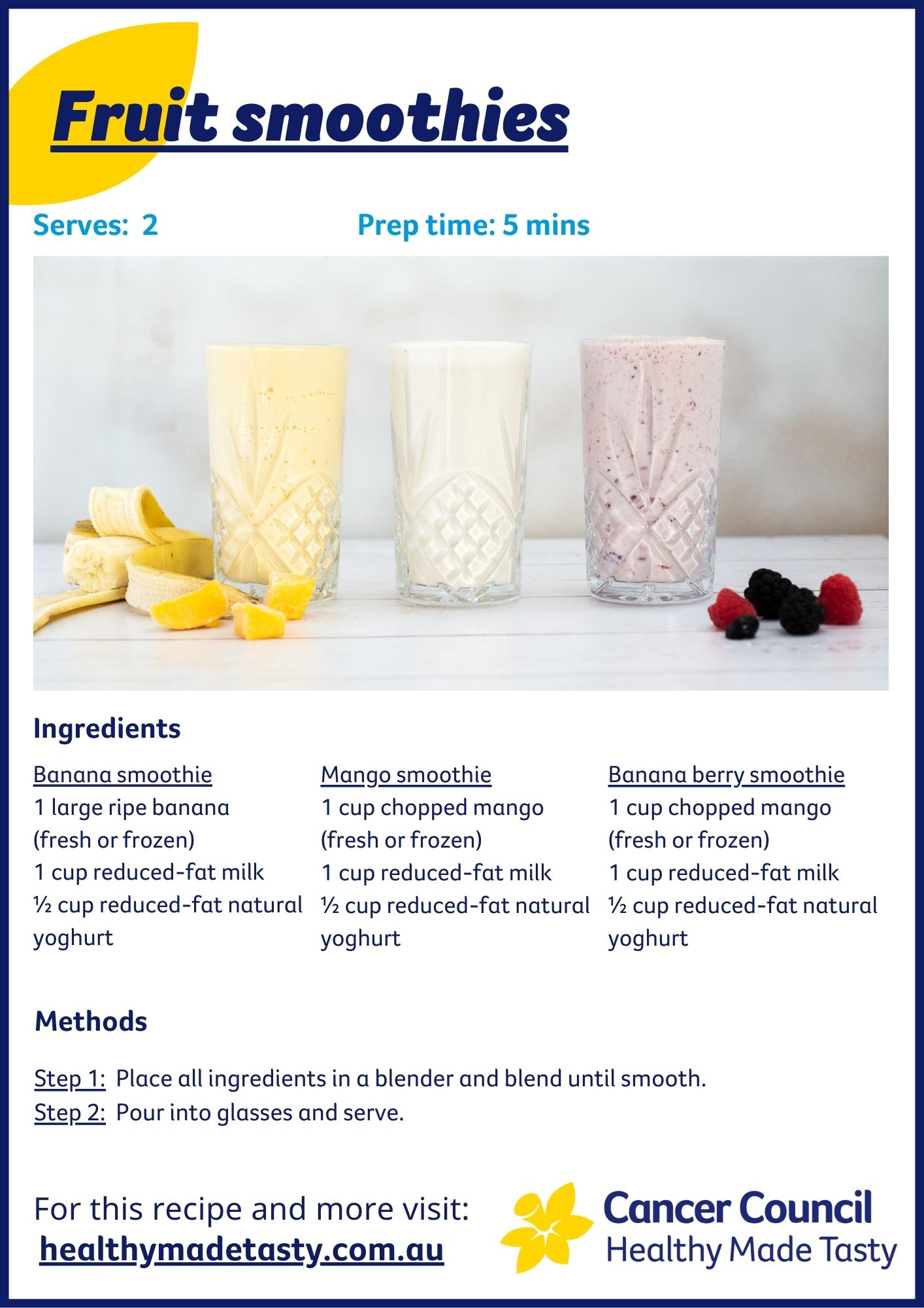 Download and share this recipe snippet. Smoothies make a delicious, filling and nutritious breakfast or snack. This fruit smoothie 3 ways recipe is ready in just a few minutes.