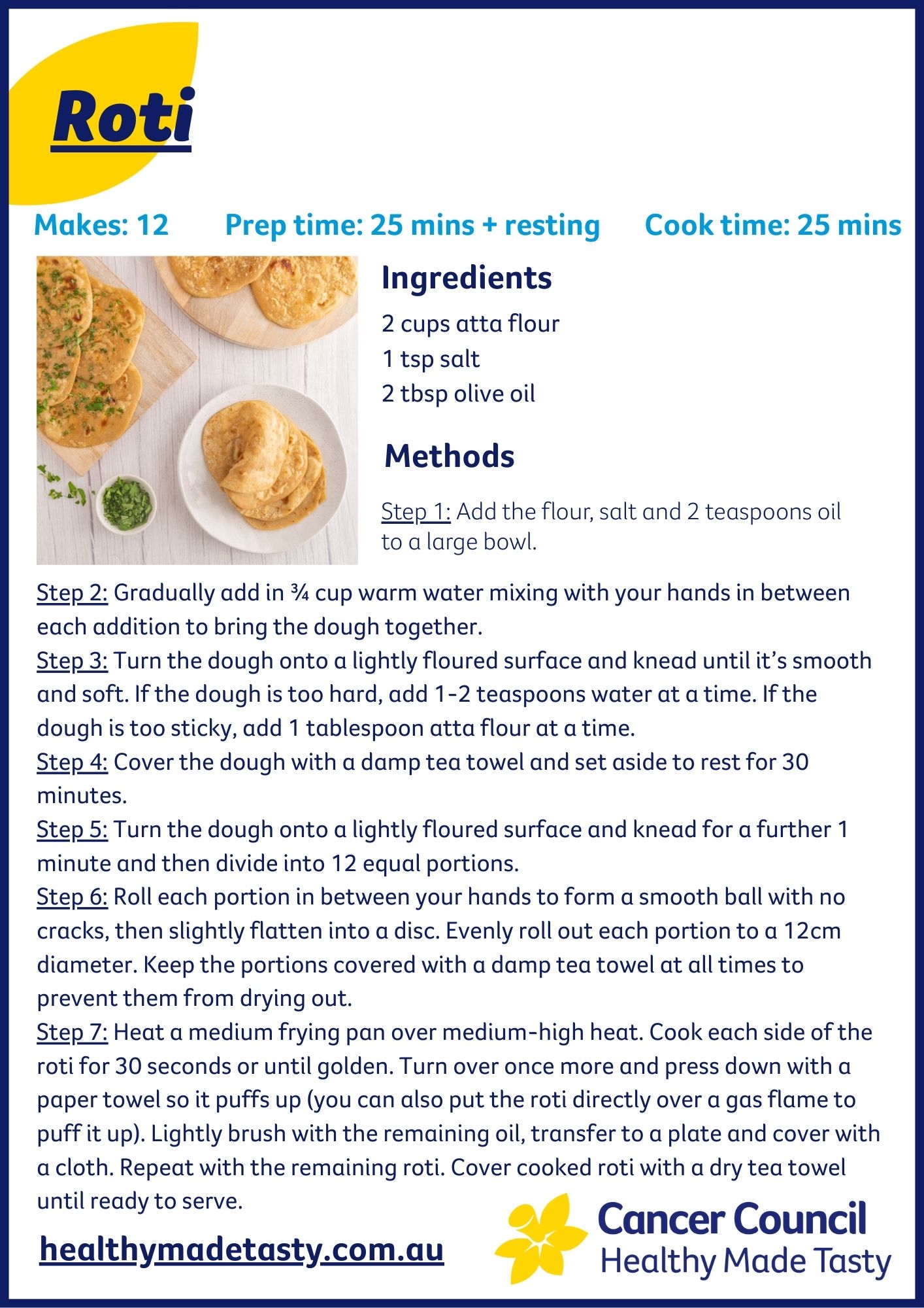 Recipe Snippets are designed to be inserted into school and community newsletters or can be printed for your recipe folder. This snippet features the recipe for roti.