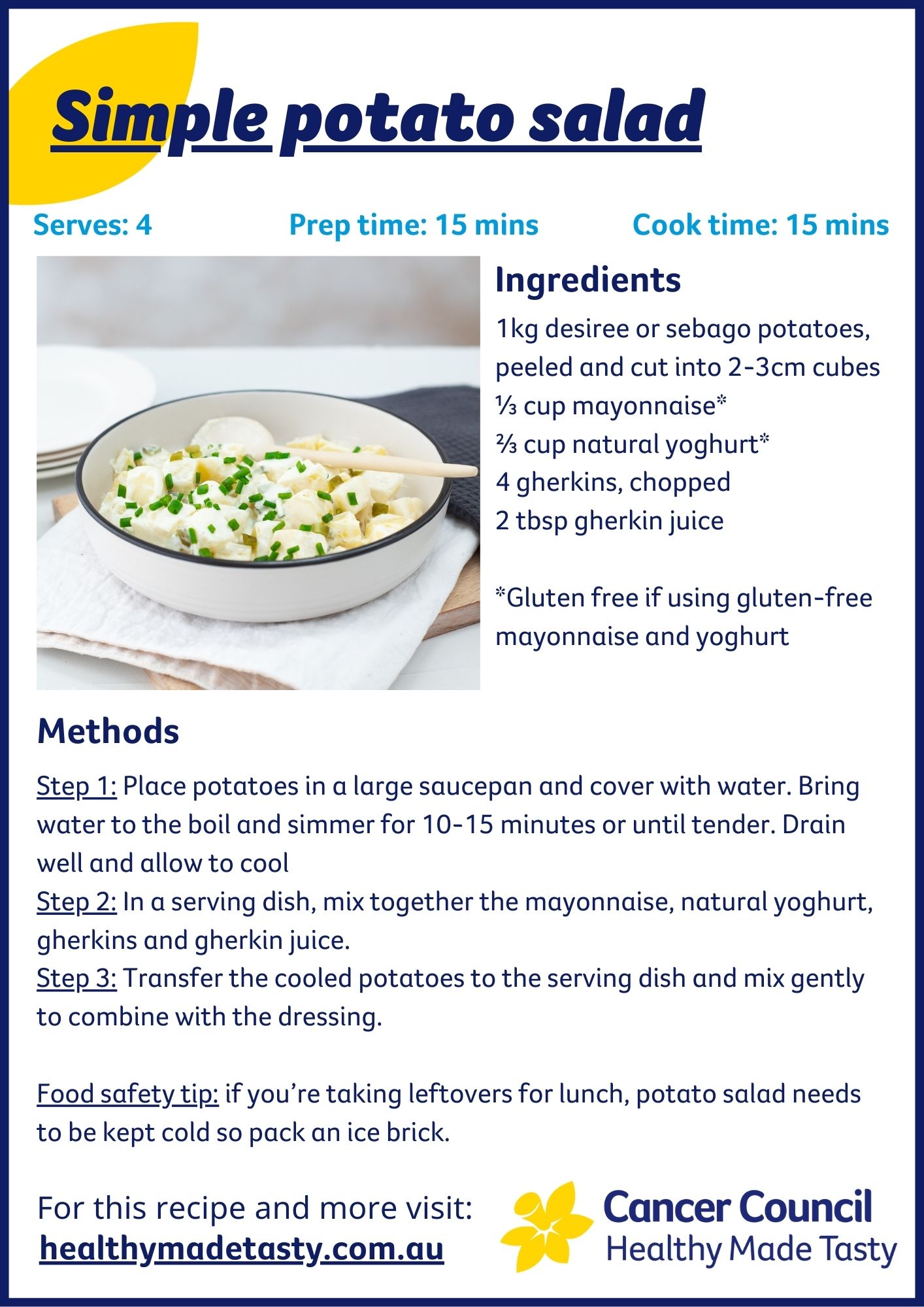 Download and share this recipe snippet. This simple potato salad recipe is made with just 5 ingredients and is the perfect addition to a BBQ. The gherkins add a pop of flavour.