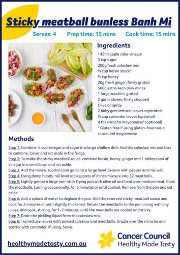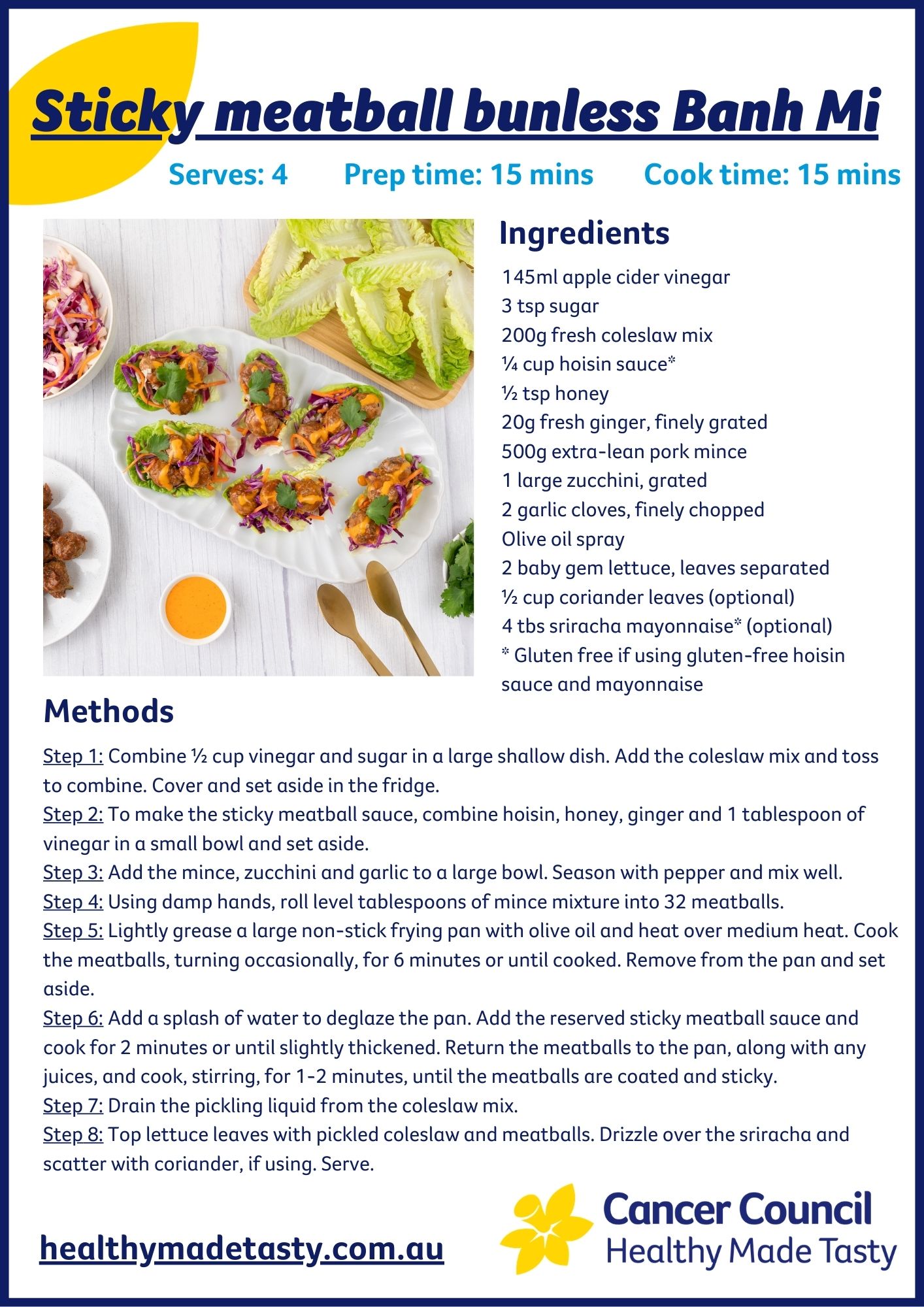 Recipe Snippets are designed to be inserted into school and community newsletters or can be printed for your recipe folder. This snippet features the recipe for sticky meatball bunless Banh Mi.