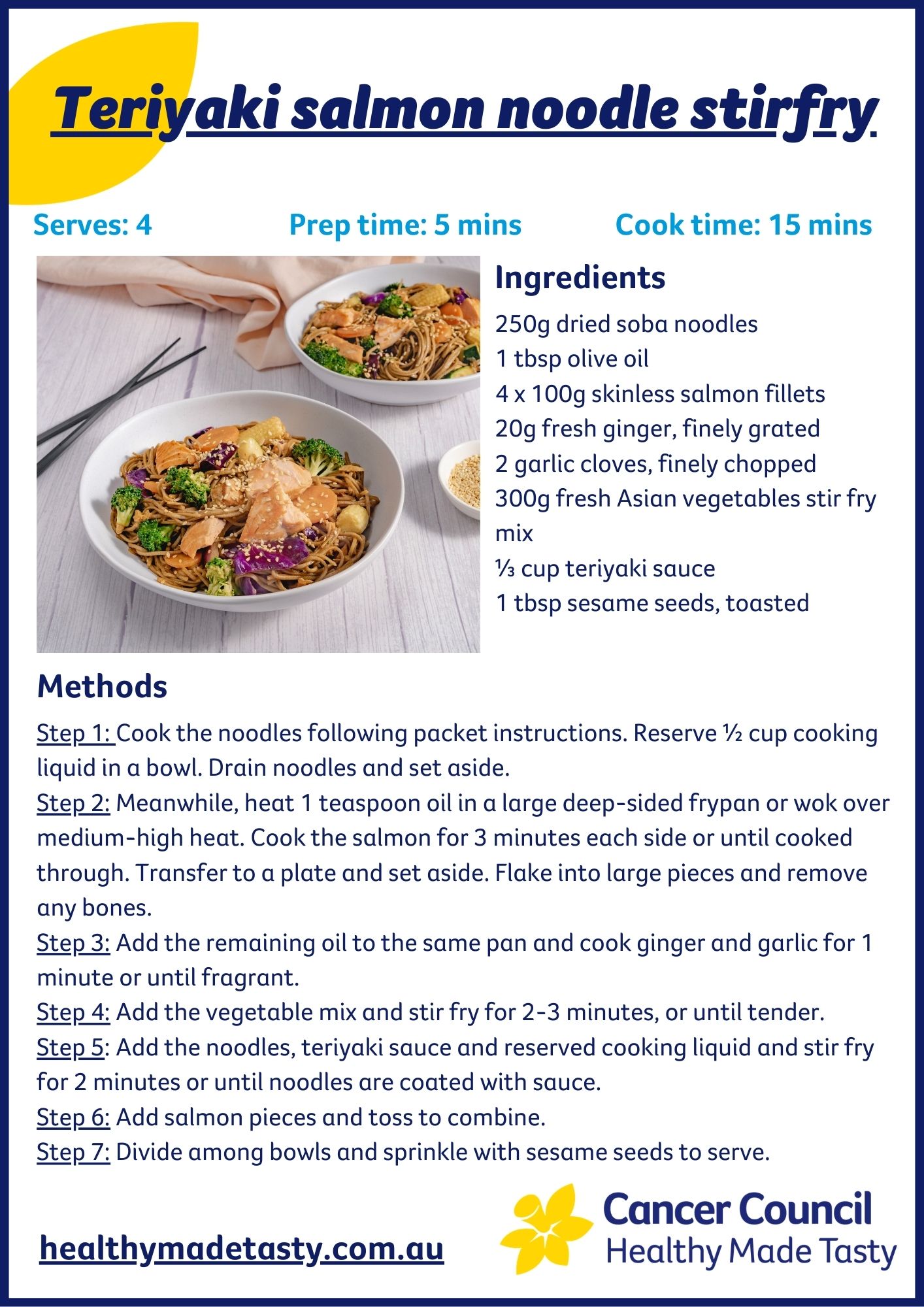 Recipe Snippets are designed to be inserted into school and community newsletters or can be printed for your recipe folder. This snippet features the recipe for teriyaki salmon noodle stir fry.